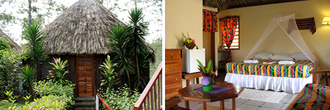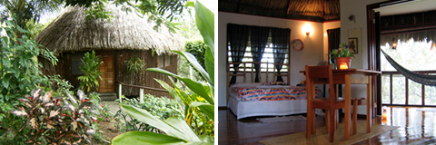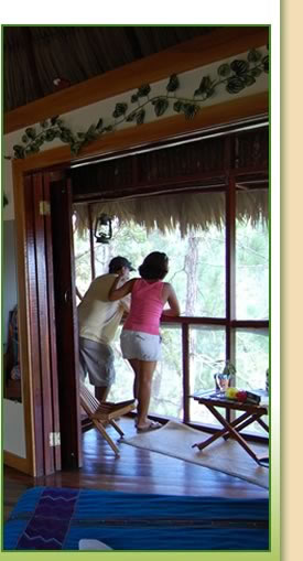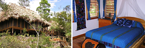 With the best views of the five sisters falls and the soothing sound of the waterfalls through the day; this mayan style cabana comes fully equipped with a private bathroom with hot & cold shower, king size bed, pullout futon, screened porch, mini-fridge and coffee maker. Great for couples, honeymooners, small families, or friends.