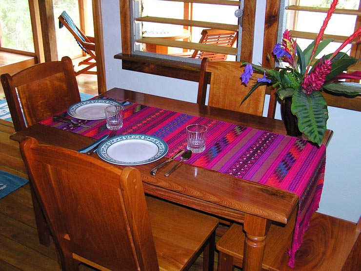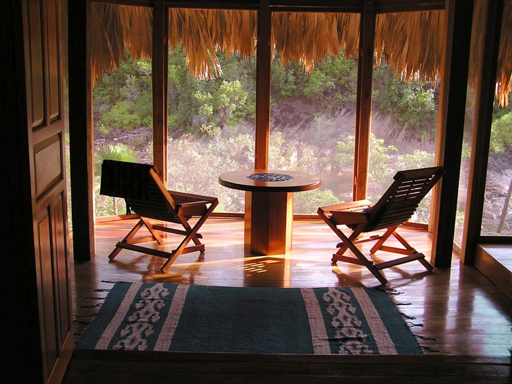 The larger cabaña contains a fully equipped kitchen, dining area, writing desk and a small library. It is surrounded on four sides with fully screened porches arranged into relaxed and comfortable living spaces. Hammocks and seating areas are situated to take advantage of the tropical gardens as well as the entrancing views of the river. All furnishings are locally made by Belizean craftsman. Colorful Mayan rugs, fabrics and wall hangings complete the cozy ambiance of the interior.